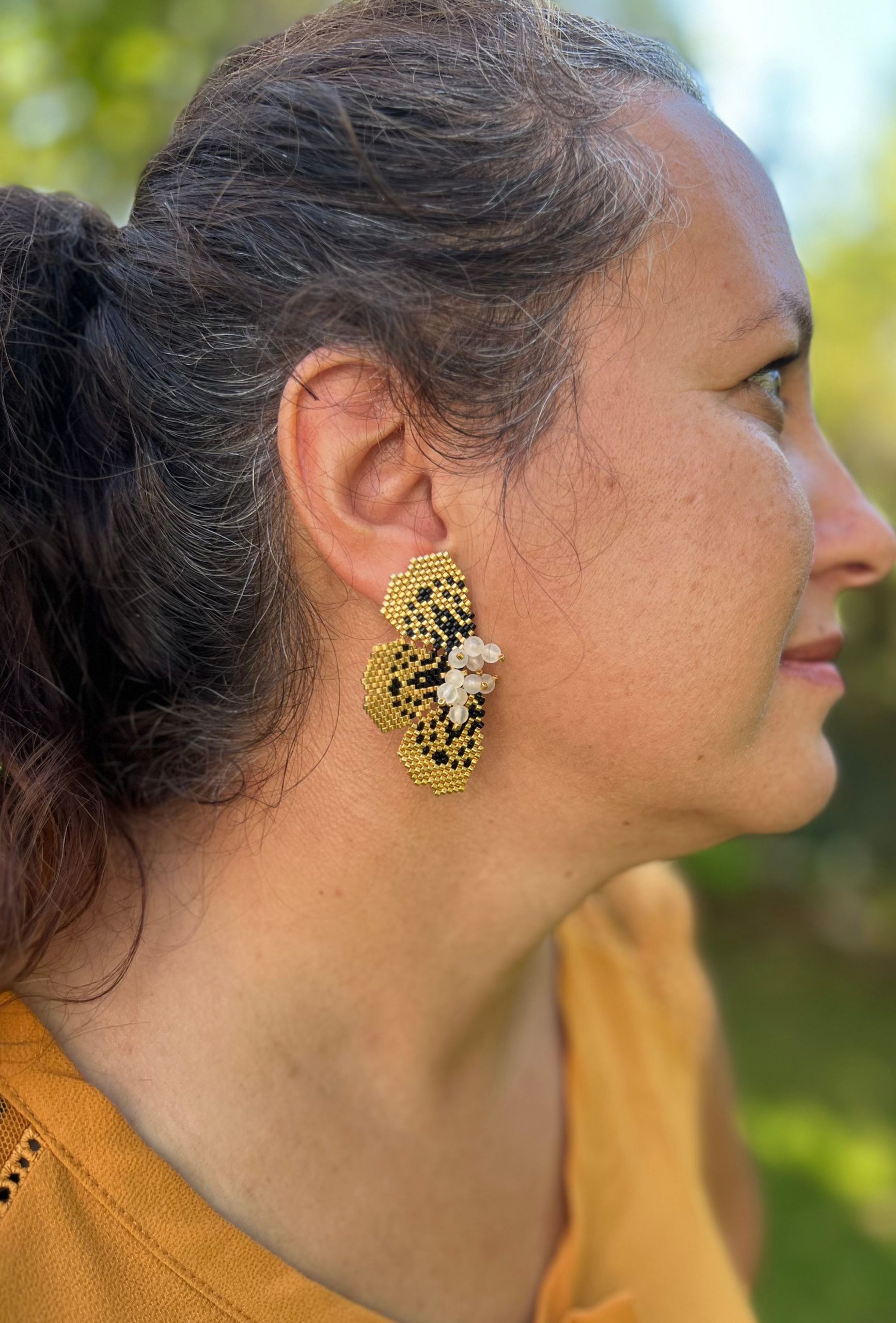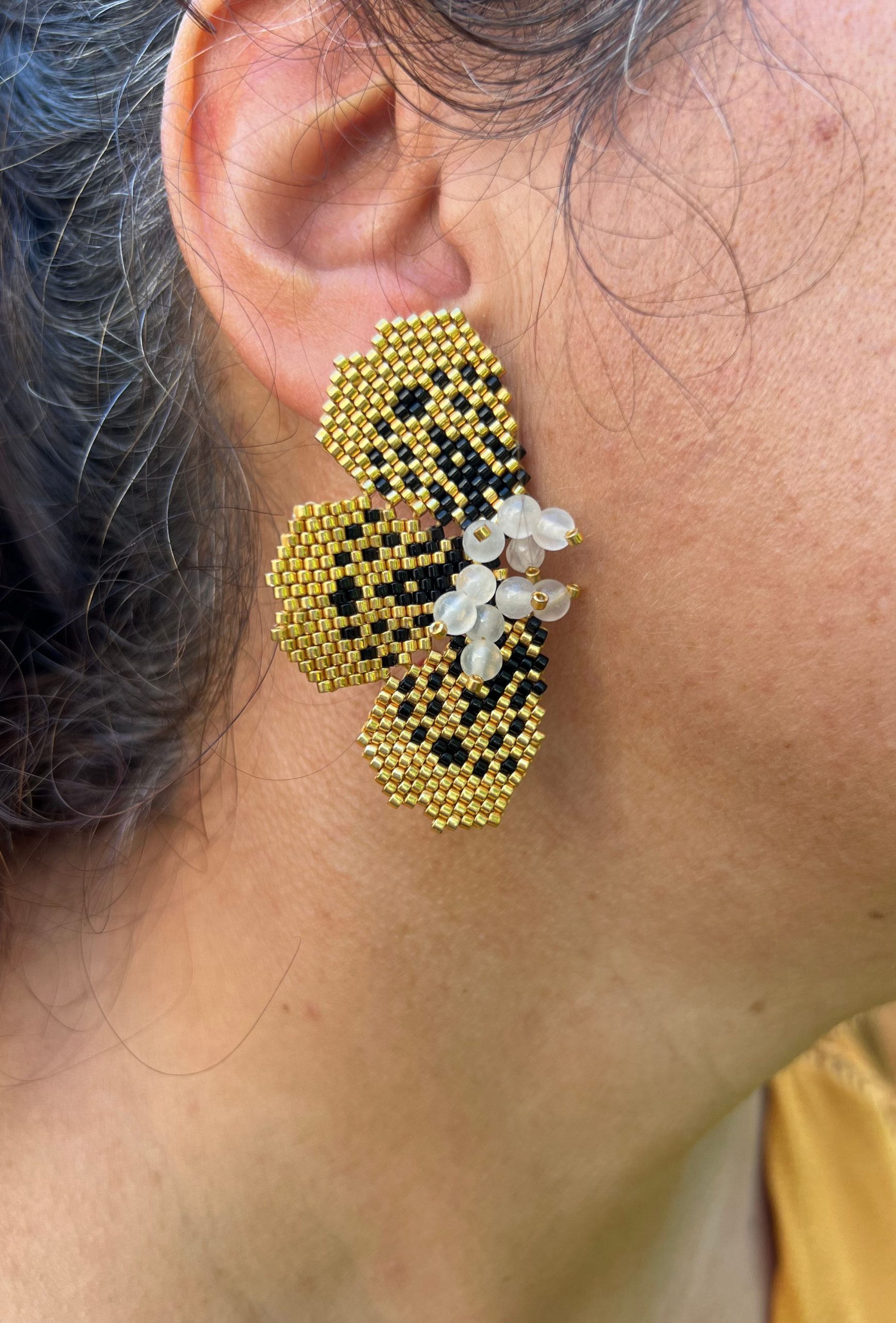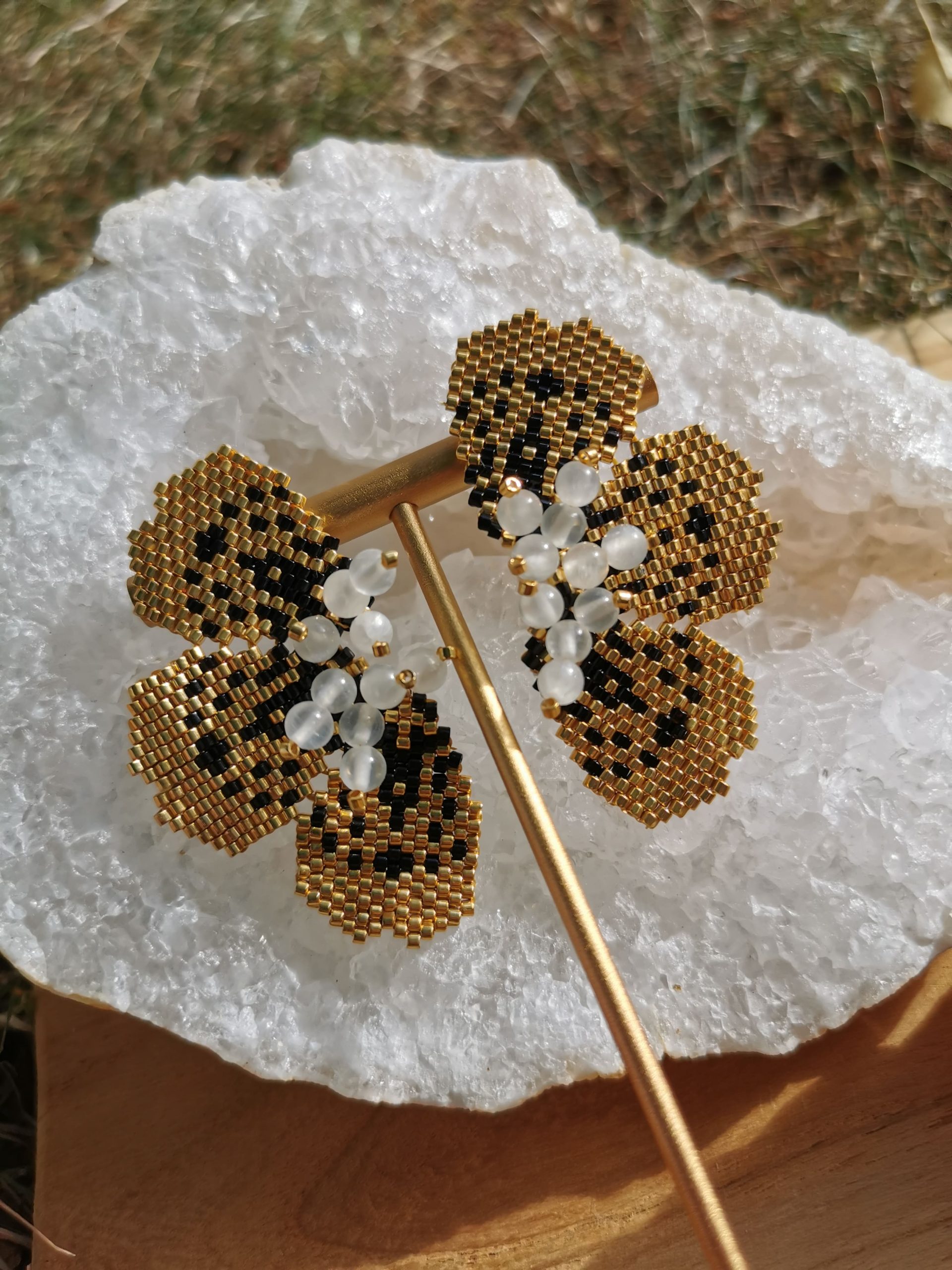 Chaque paire est entièrement tissée à la main dans mon atelier, avec des perles japonaises Miyuki dorées et des perles de sélénite soigneusement choisies pour leur pureté et leur éclat nacré.