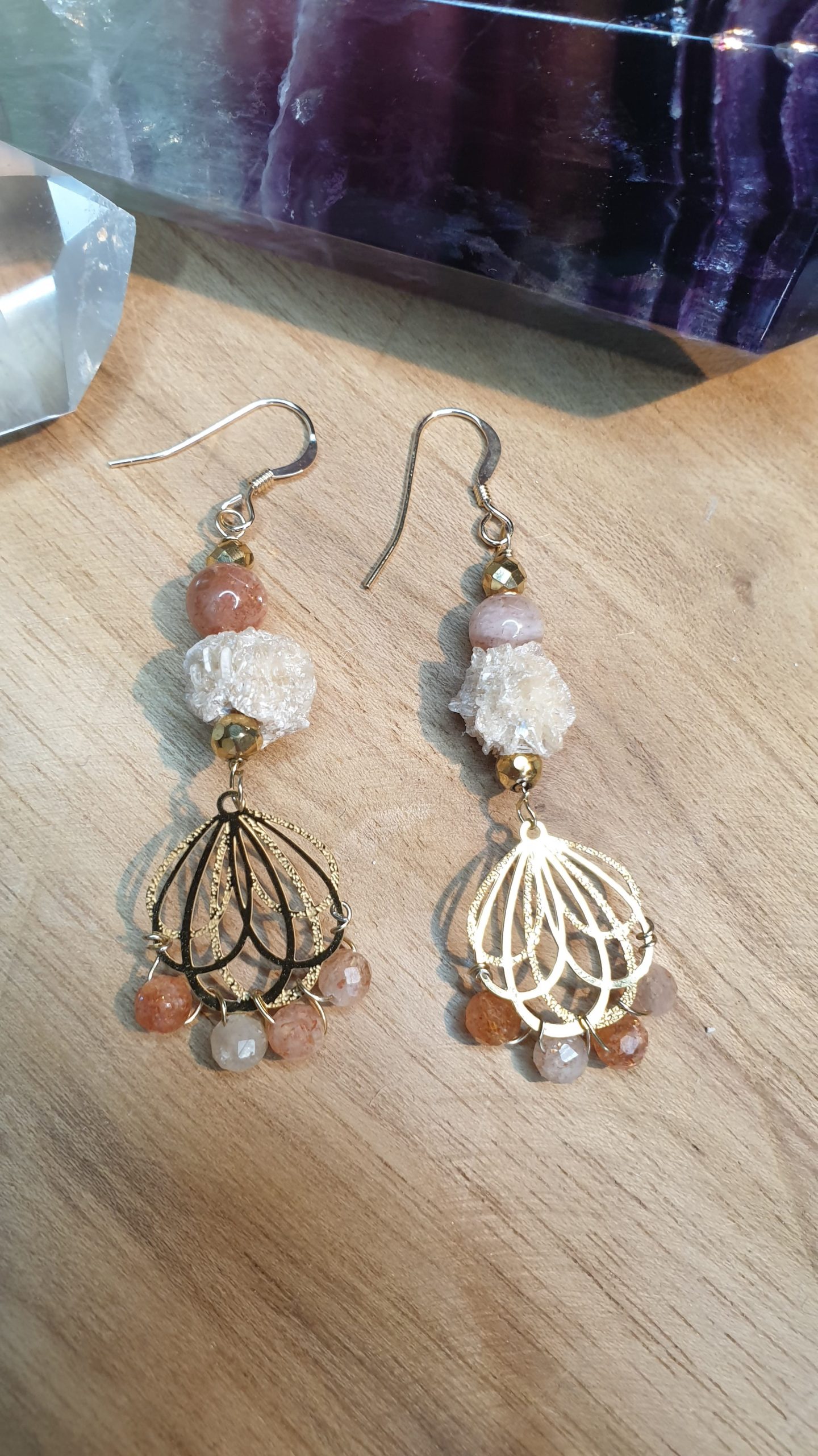 Façonnées à la main dans mon atelier, ces boucles incarnent la rencontre entre l’énergie solaire du minéral et la douceur du doré.