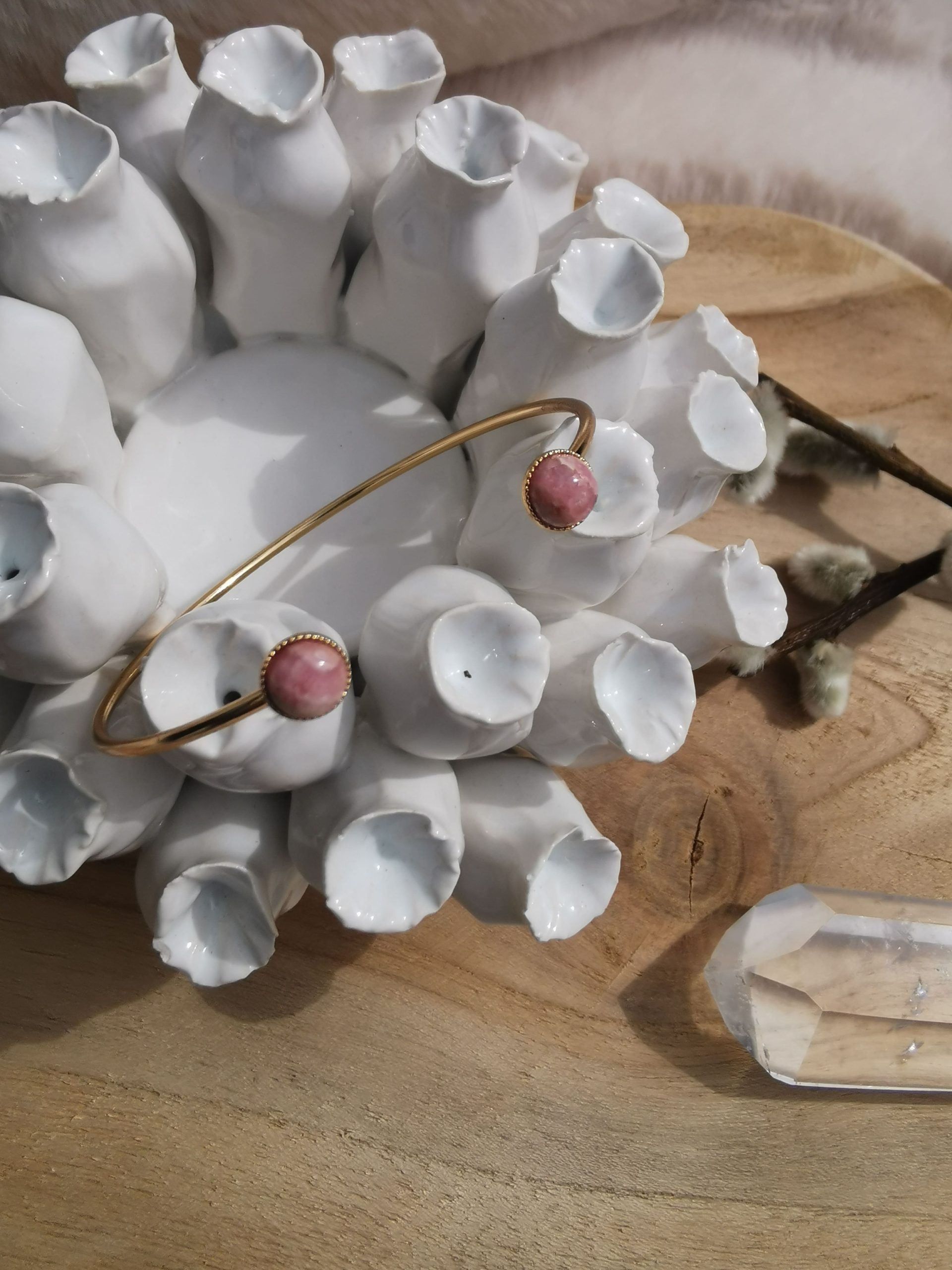 Le bracelet Tellus unit la brillance dorée du métal à la tendresse vibrante de la rhodochrosite.