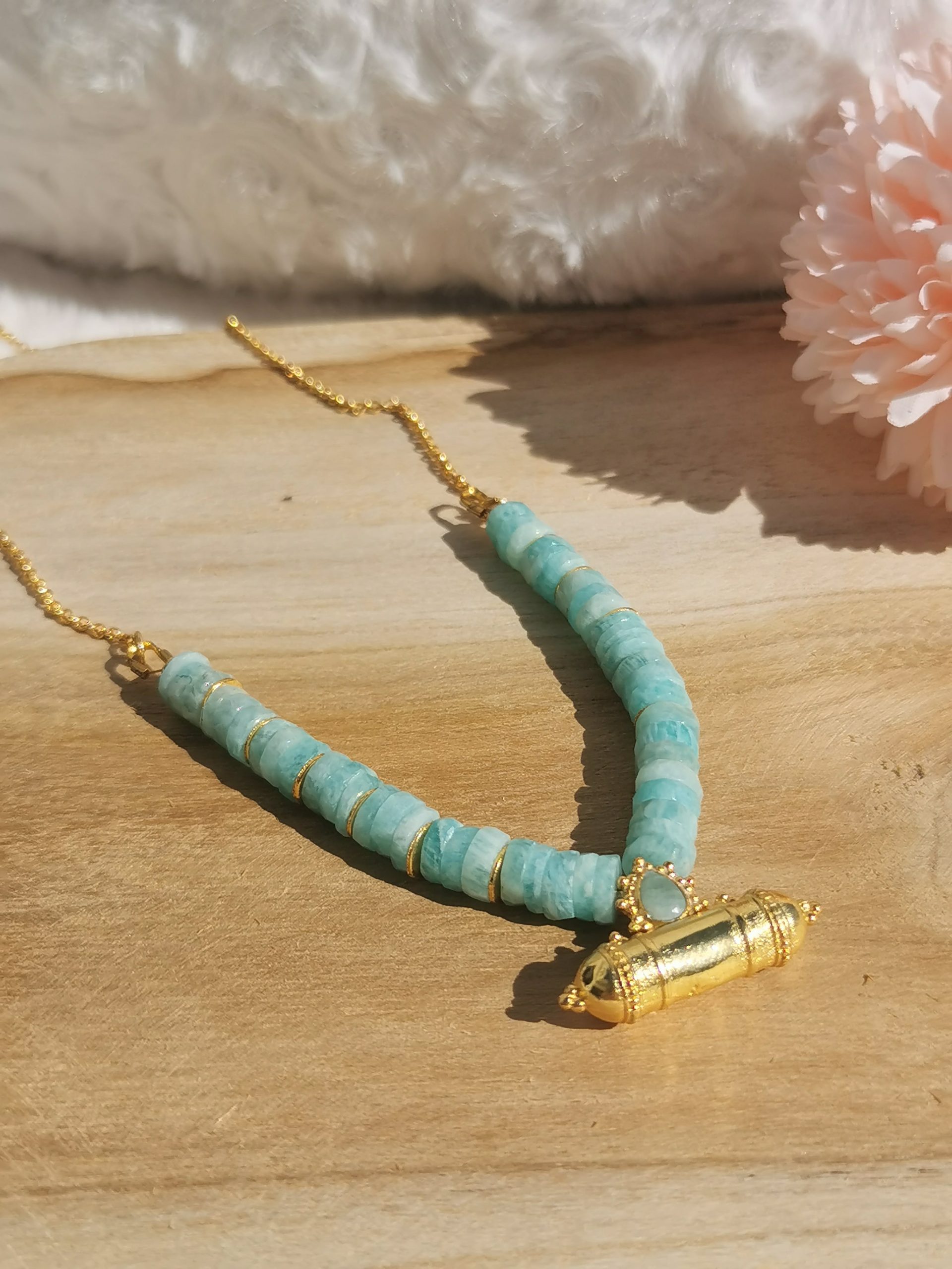 Le Collier Hathor en Amazonite unit l’éclat doré à la paix intérieure.