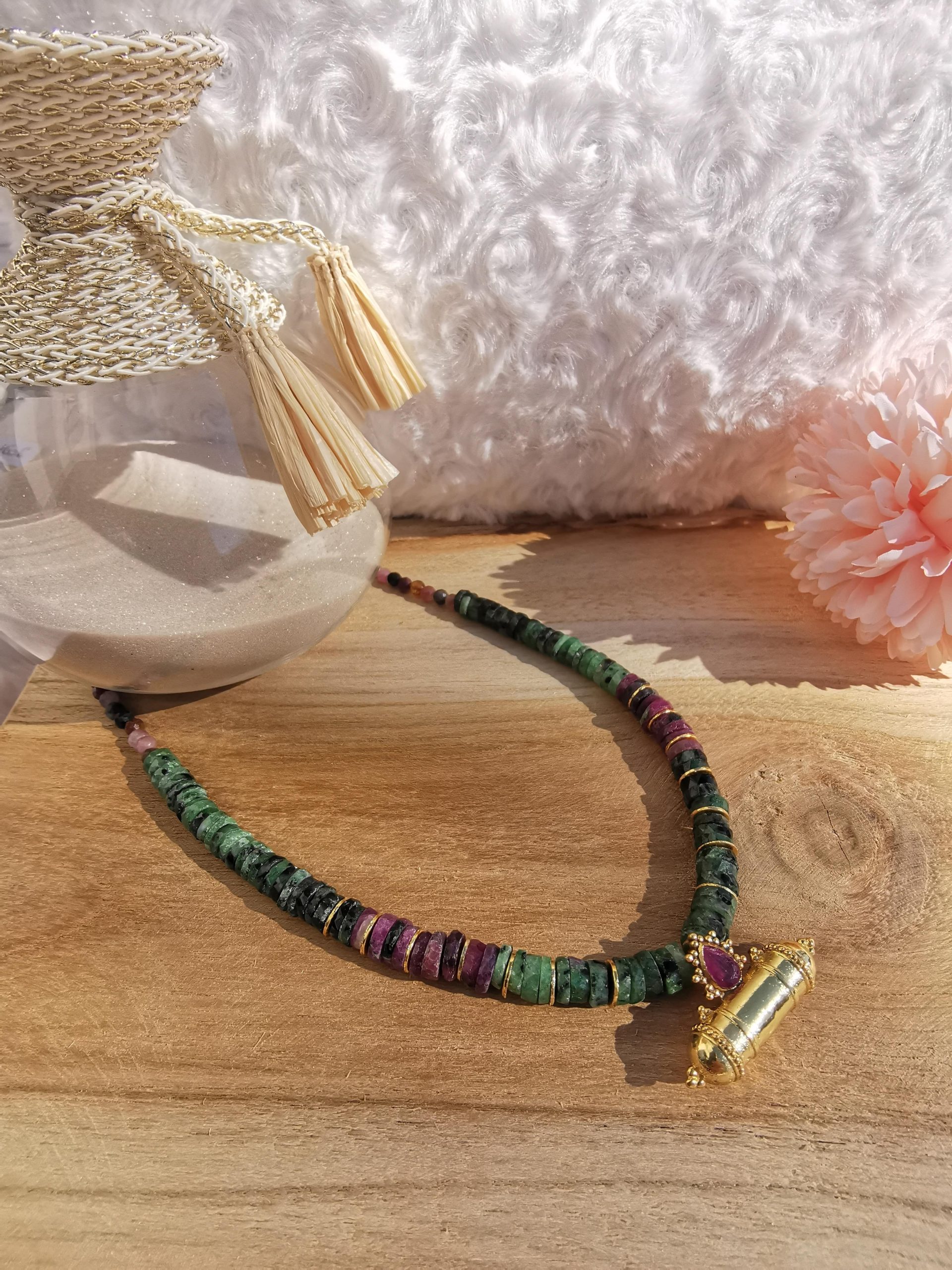 Le collier Isis en Rubis Zoïsite et Rubis est un hommage à la femme qui se transforme, qui s’élève et qui ose rayonner.